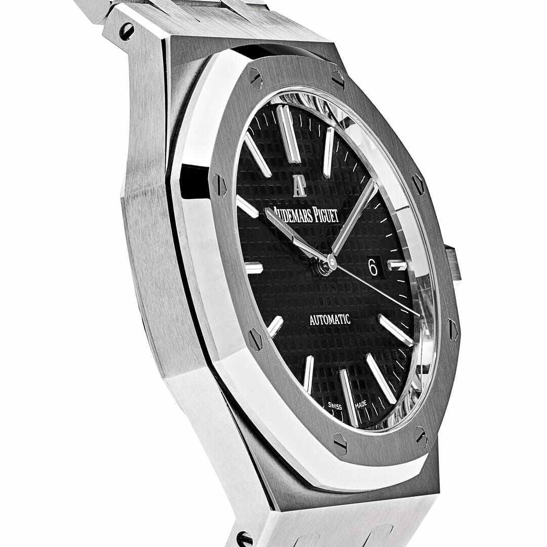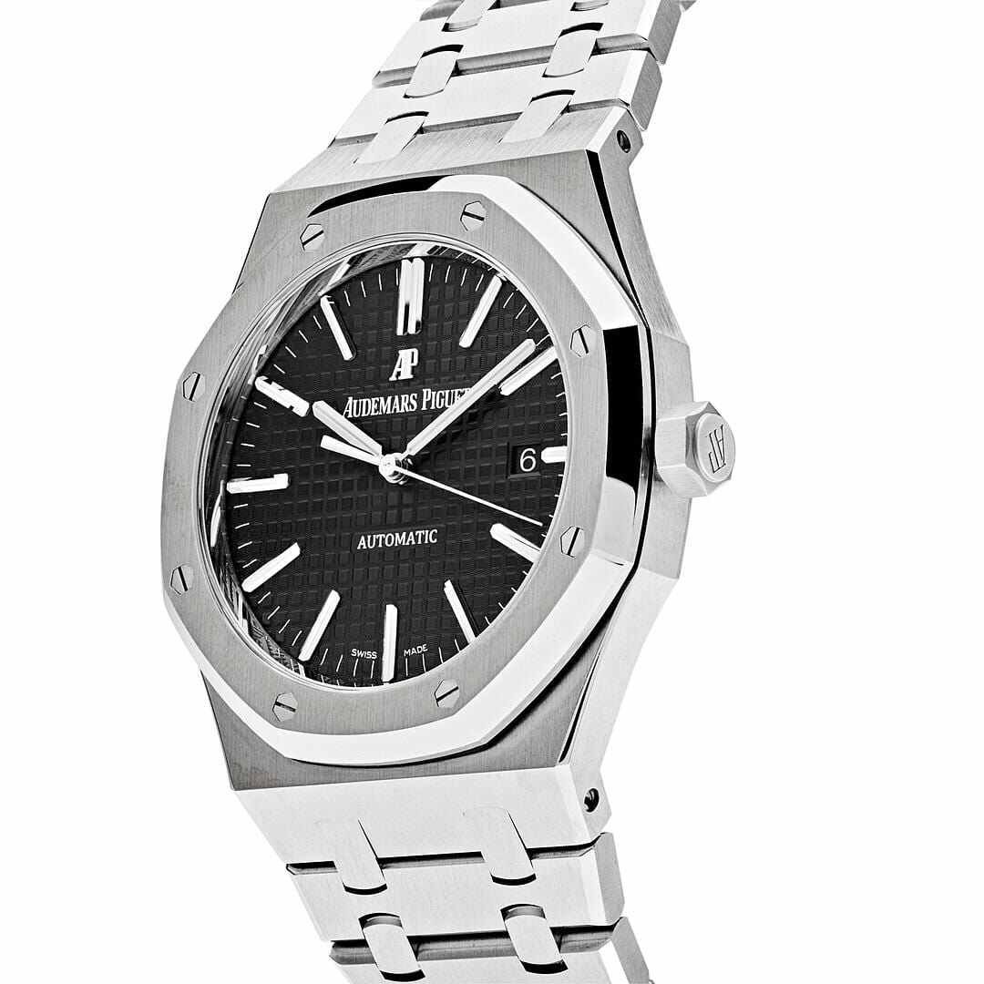This Royal Oak Selfwinding is designed in a 41mm stainless steel case with a smooth octagonal bezel. It features a black ‘Grande Tapisserie’ pattern on the dial, white gold markers and hands, and a date set at 3 o’clock. The watch is complemented by a stainless steel bracelet and AP folding clasp.
