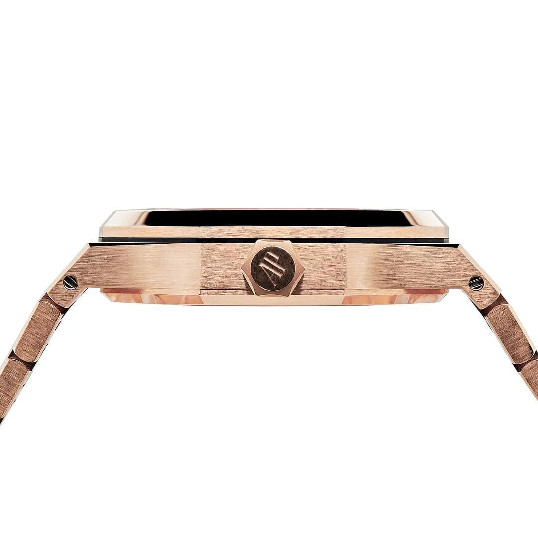 Diese Royal Oak Double Balance Wheel ist mit einem 37-mm-Gehäuse aus 18 Karat Roségold und einer Lünette aus Roségold ausgestattet. Das schöne, durchbrochene, rhodinierte Zifferblatt enthält roségoldene applizierte Indexe und wird durch ein entspiegeltes Saphirglas und einen Gehäuseboden geschützt. Die Uhr ist an einem Armband aus 18 Karat Roségold mit AP-Faltschließe gefertigt.