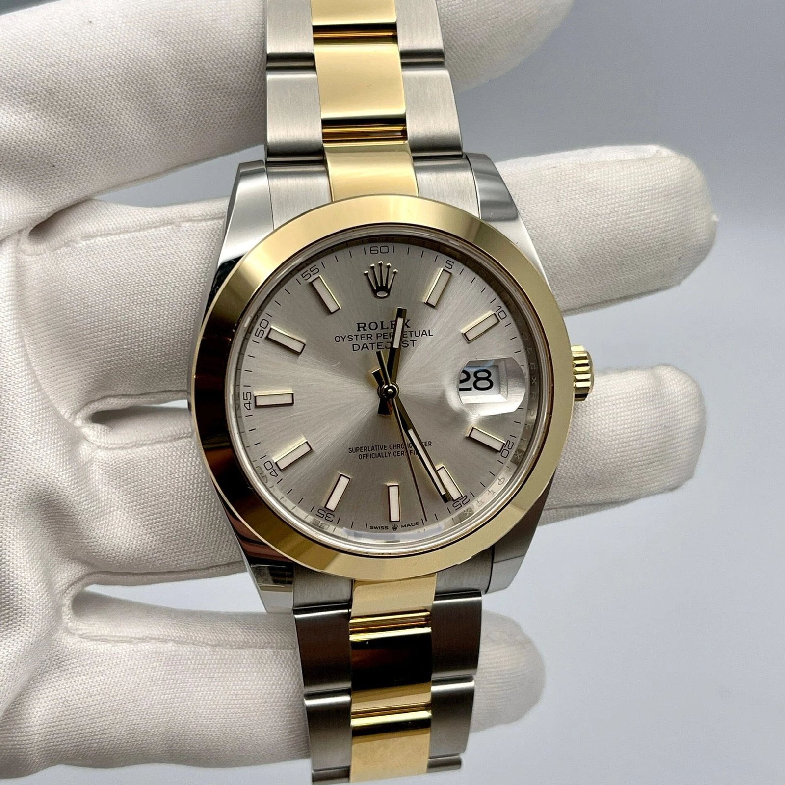 The Rolex Datejust is designed with a 41mm stainless steel and yellow gold case. highlighted with a yellow gold smooth bezel. It features a bright silver colored dial with highly legible chromalight display with long-lasting blue luminescence. a date display at 3 o’clock and a protective scratch-resistant sapphire-crystal. On the wrist. the stainless steel and 18k yellow gold oyster bracelet is a true beauty.