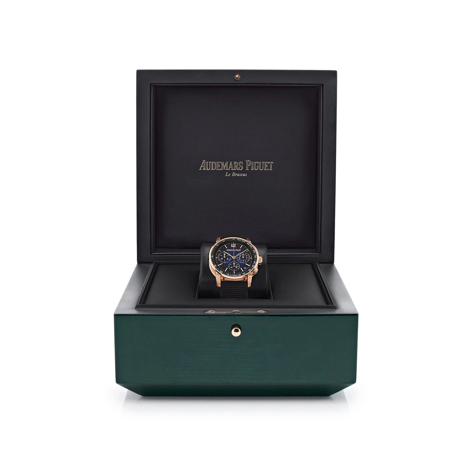 This Audemars Piguet Code 11.59 is designed in a 41mm rose gold case with a smooth round bezel. It features a lacquered smoked blue dial with three sub-dials. Its functions include an integrated column-wheel chronograph mechanism and flyback capabilities. allowing an instant restart of the stopwatch without stopping and resetting the time.