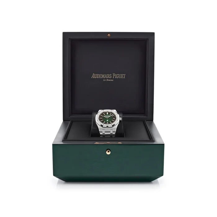 AP Royal Oak 15202PT.OO.1240PT.01 39 mm. The watch has Smoked green Dial w/ Royal Oak hands. The Case is Platino w/ 2121 Movement w/ 36 jewels. 40 hours power reserve. The Bracelet is Platino with AP folding clasp. The Water-resistant is up to 50 m.