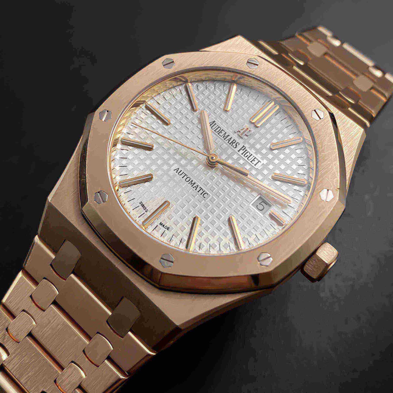 Marca: Silver-toned dial with Grande Tapisserie pattern. Rose gold applied hour-markers and Royal Oak hands with luminescent coating
