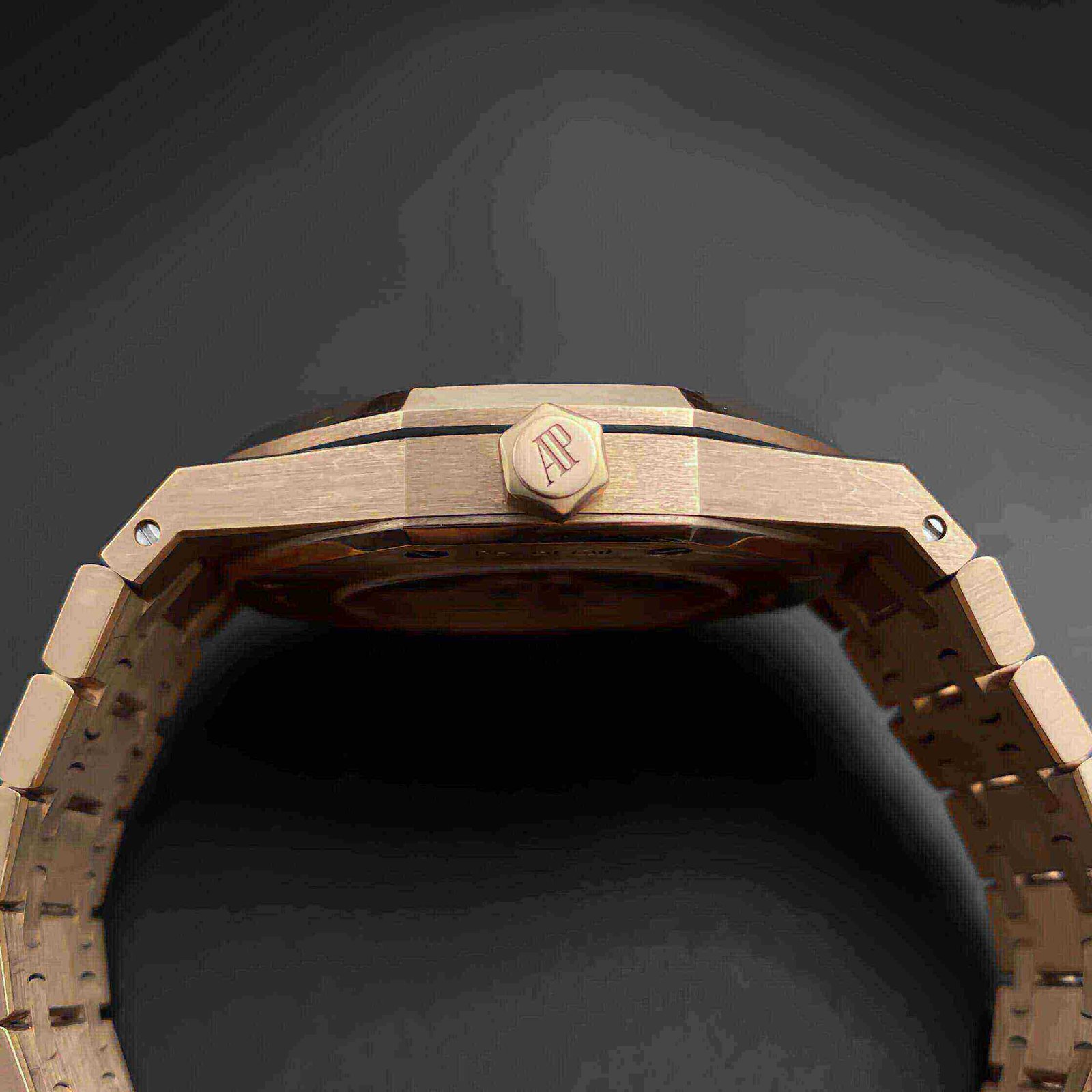 AP Royal Oak Self Winding Silver-toned dial 41mm Rose Gold Watch 15400OR.OO.1220OR.02 . AP Royal Oak Selfwinding 41mm Watches. 41mm x 9.80mm 18K rose gold case. sapphire crystal back. screw-locked crown. glareproofed sapphire crystal. silver dial with grande tapisserie pattern. rose gold applied hour-markers with luminescent coating. and rose gold Royal Oak hands with luminescent coating. self-winding AP Calibre 3120 movement with date and large seconds. approximately 60 hours of power reserve. 18K rose gold bracelet. Water resistant to 50 meters.