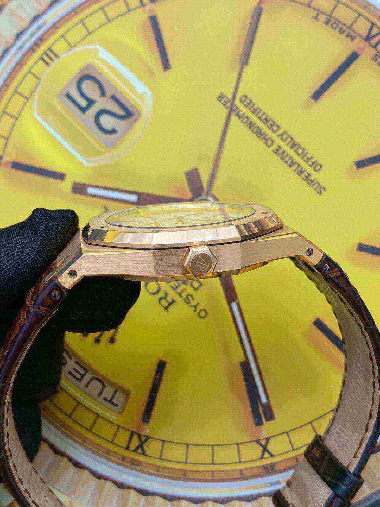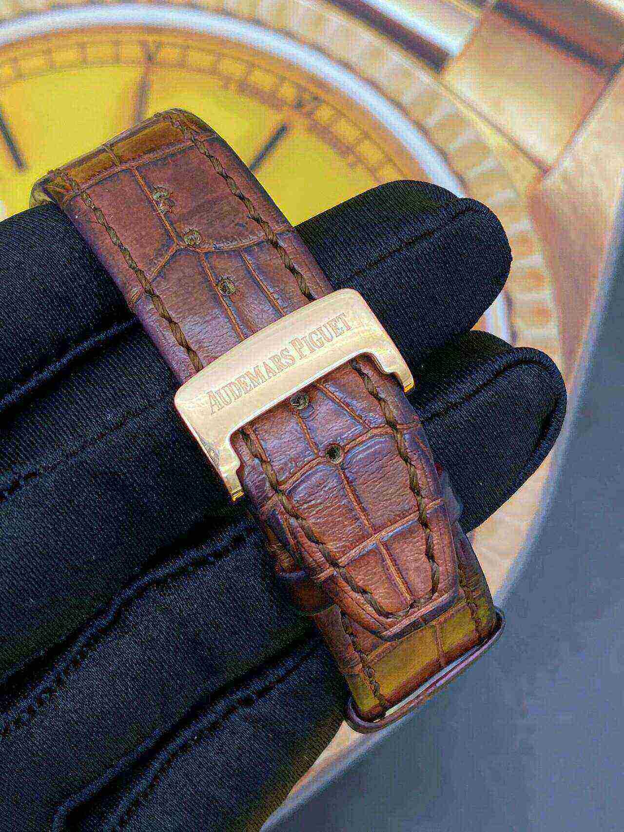 AP Royal Oak Selfwinding 15300BA.OO.D088CR.01. 39 mm. The watch has Silvered Dial w/ Gold Royal Oak hands. The Case is 18k Yellow gold w/ 3120 Movement w/ 40 jewels. 60 hours power reserve. Hand-stitched large square scale crocodile strap with AP folding clasp. The Water-resistant is up to 50 m.