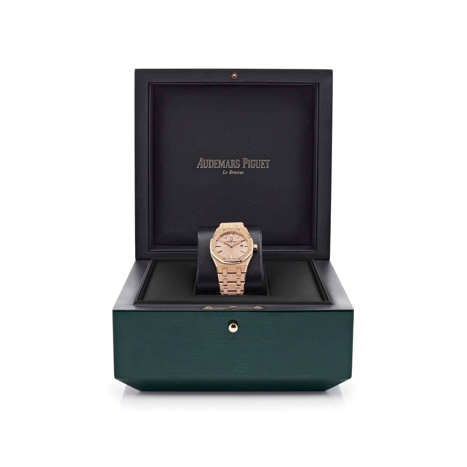 This Royal Oak Quartz timepiece is designed in a 33mm case crafted in rose gold with the allure of ‘diamond dust’ sparkle. Thanks to tiny. light-refracting indentations – a result of a hammering technique and perfected by Audemars Piguet craftspeople – as the wholly contemporary Frosted Gold finishing. It features the ‘Grande Tapisserie’ pattern on the pink gold-toned dial and is complimented by a rose gold bracelet with AP folding clasp.