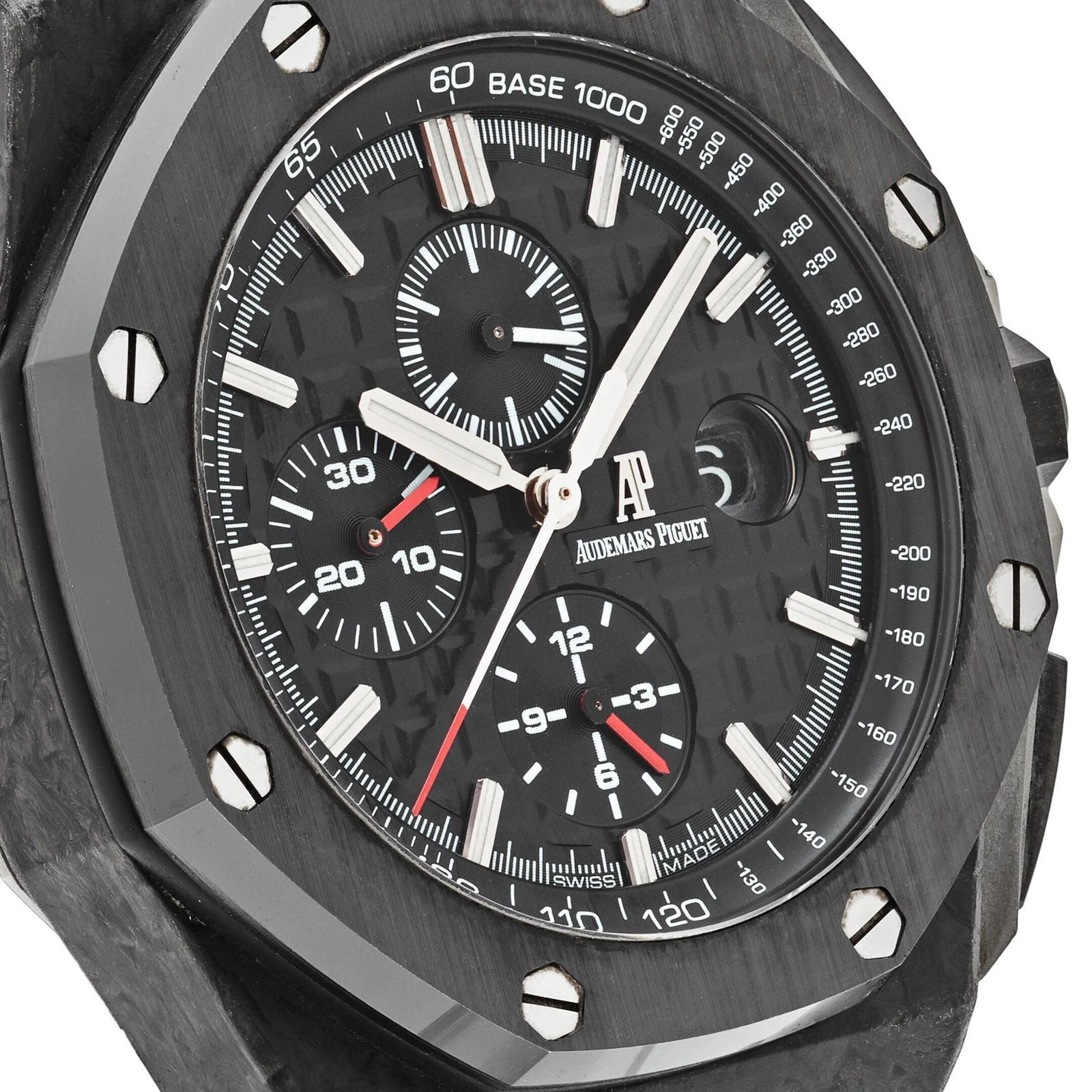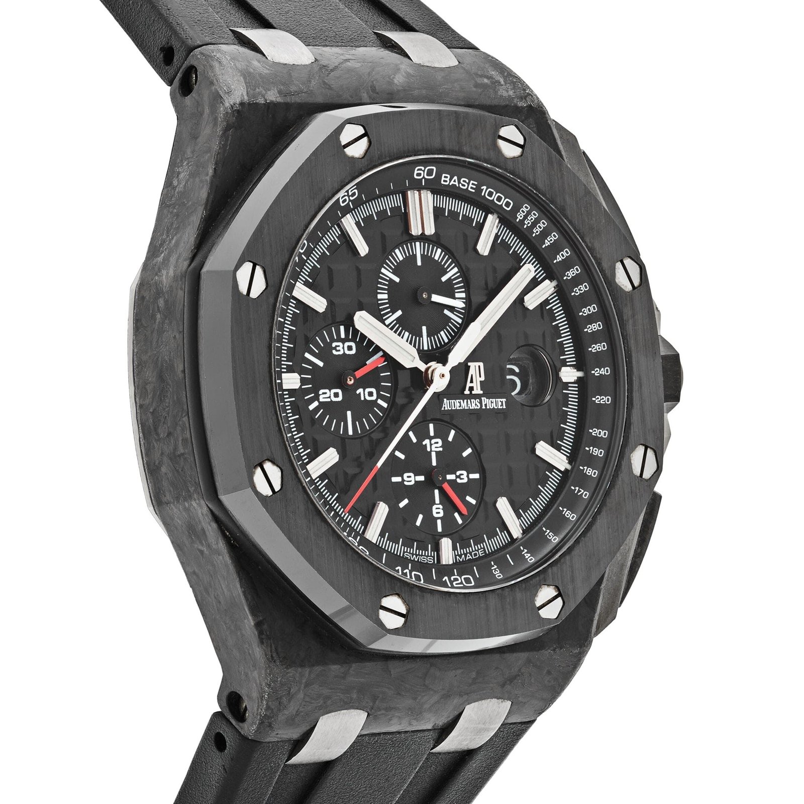 This Royal Oak Offshore timepiece is designed in a 44mm forged carbon case and black ceramic bezel. It features a black dial with ‘Mega Tapisserie’ pattern and black counters. It is equipped with small seconds sub-dial at 12 o’clock and a sapphire-crystal case with a transparent case back. This ultra-lightweight timepiece comes on a black rubber strap with a titanium ardillon buckle.