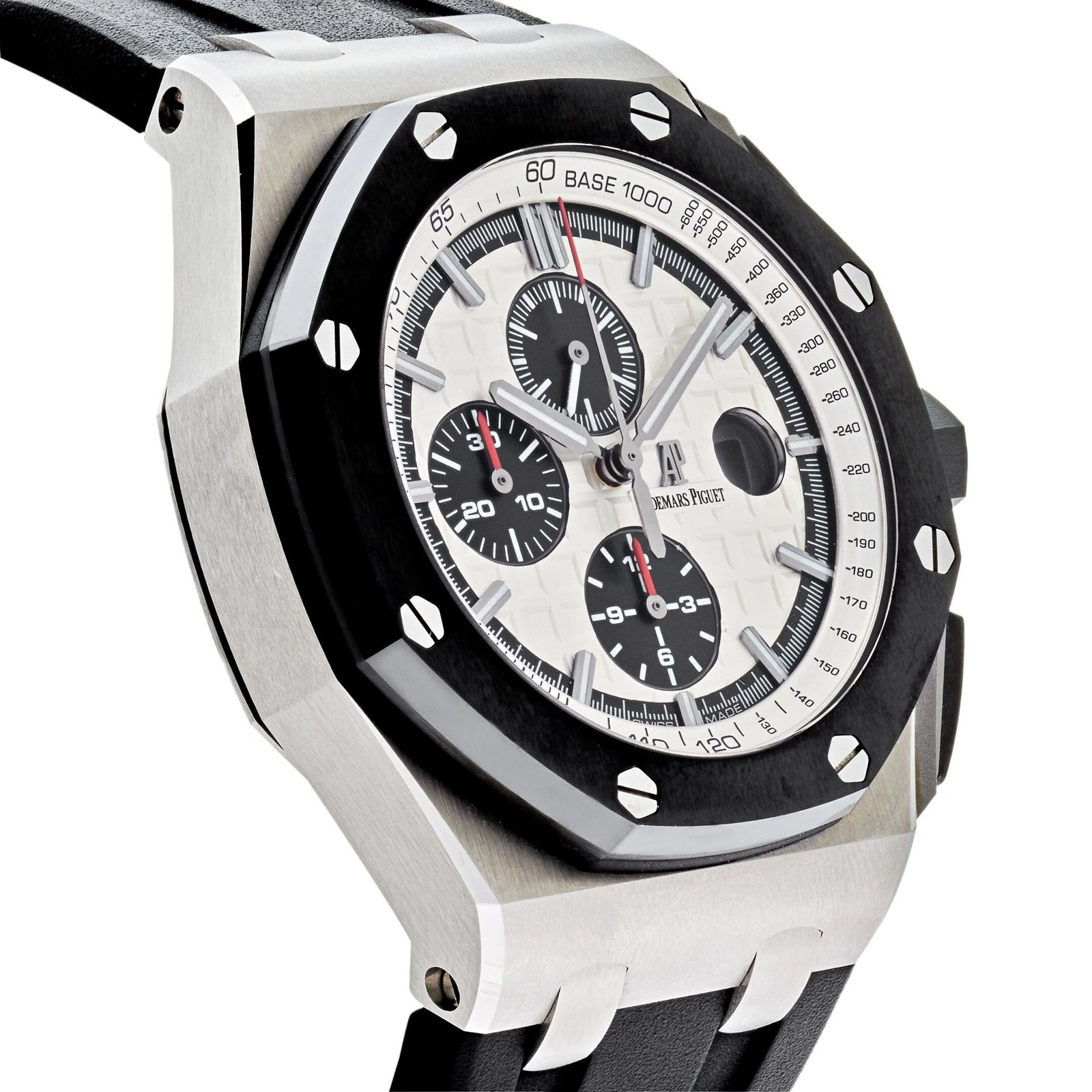 The silver dial. adorned with the Mega Tapisserie pattern. adds depth and texture. while the black subdials provide a striking contrast for enhanced readability. Luminous hands and markers ensure visibility in all lighting conditions. Equipped with a black rubber strap for durability and comfort. this chronograph also includes a tachymeter scale on the inner bezel. underscoring its functional design. Perfect for collectors who appreciate both form and function. the 26400SO.OO.A002CA.01 is a standout piece in the Royal Oak Offshore lineup.
