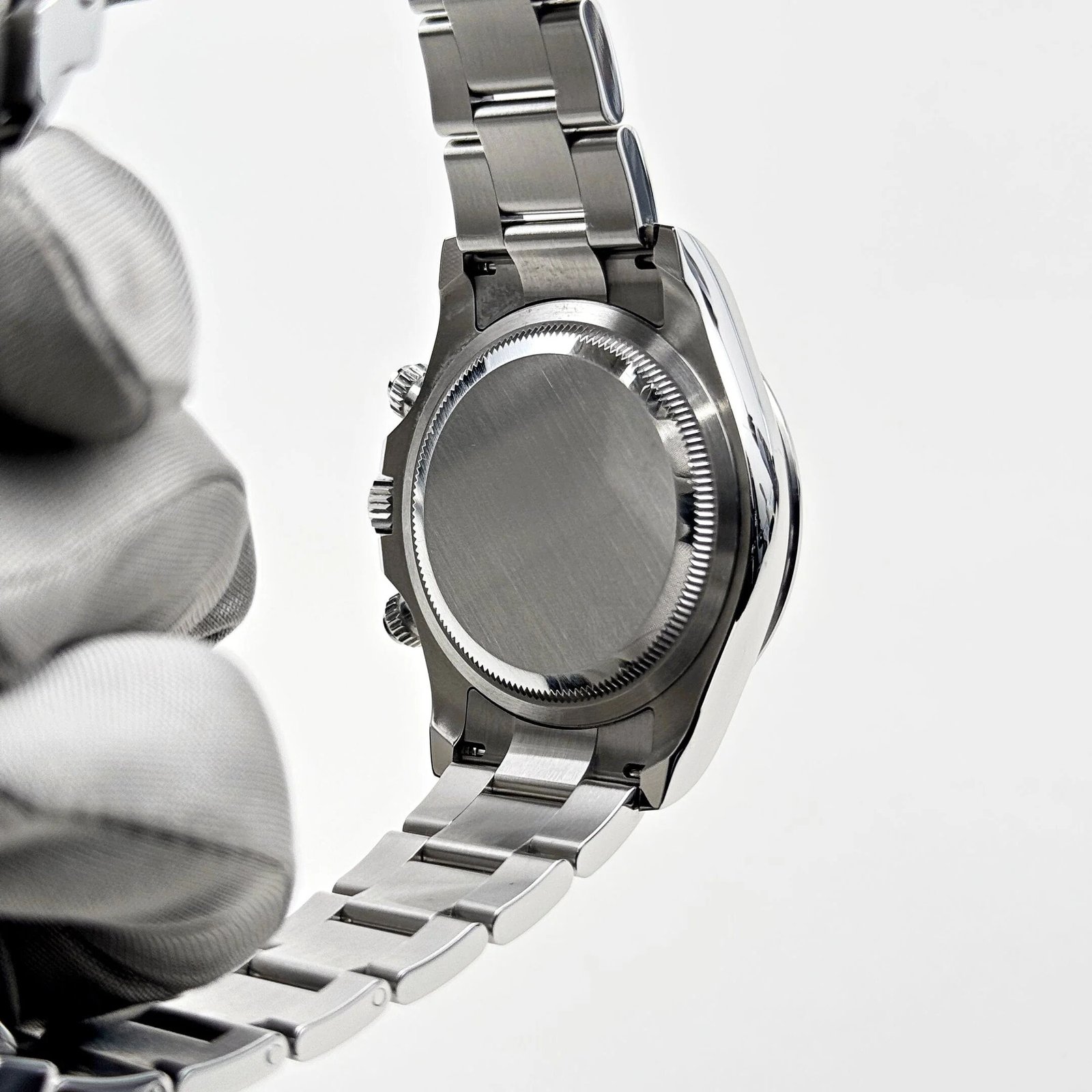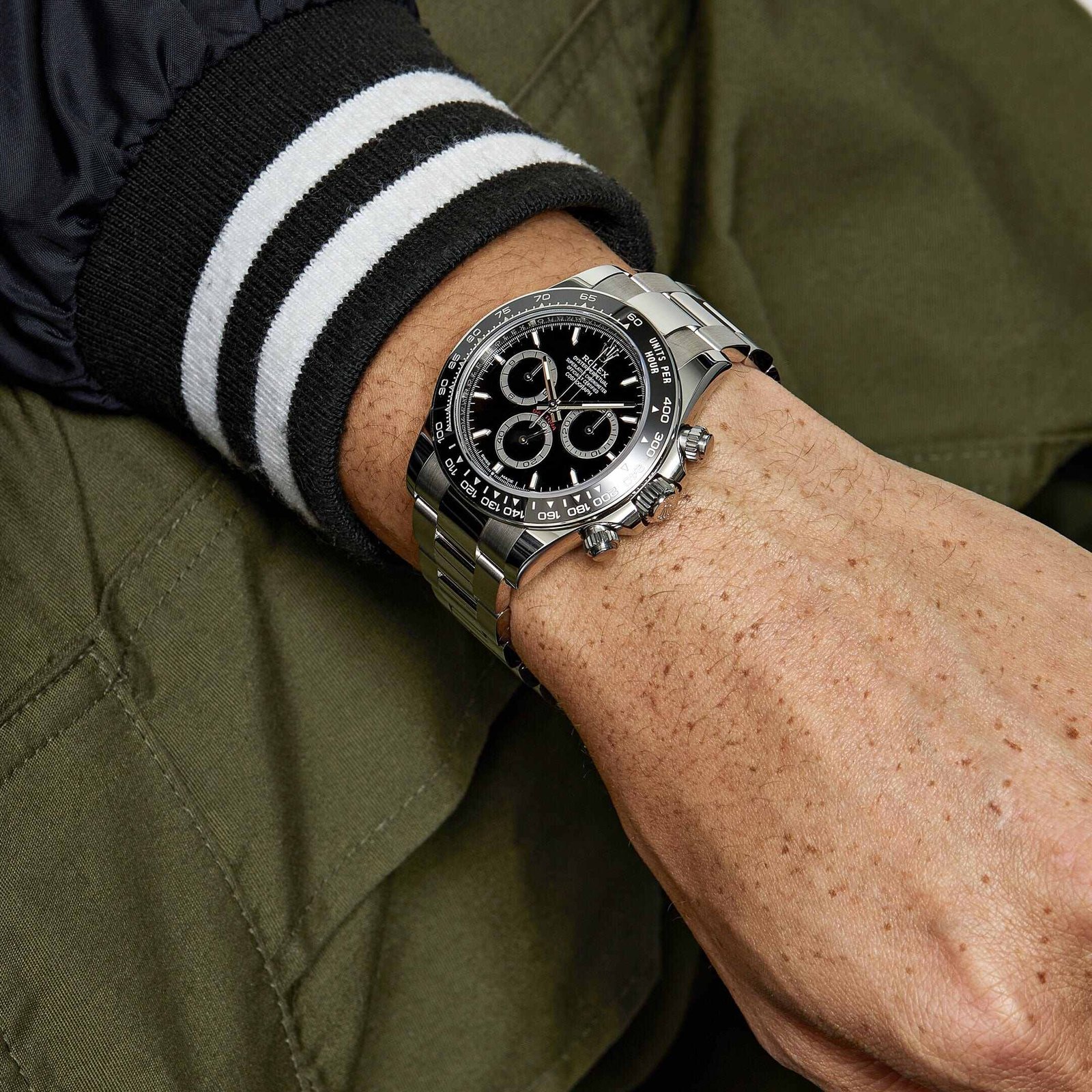 The Rolex Daytona 126500LN is designed in 40mm stainless steel with a black dial and styled on an Oyster bracelet. Luminous hour markers and hands include a Chromalight display for optimal legibility. The black bezel is engraved with a tachymetric scale and hosts the high-performance Chronograph. Complications include a 30-minute counter, a 12-hour counter, and stop seconds for setting the exact time.
