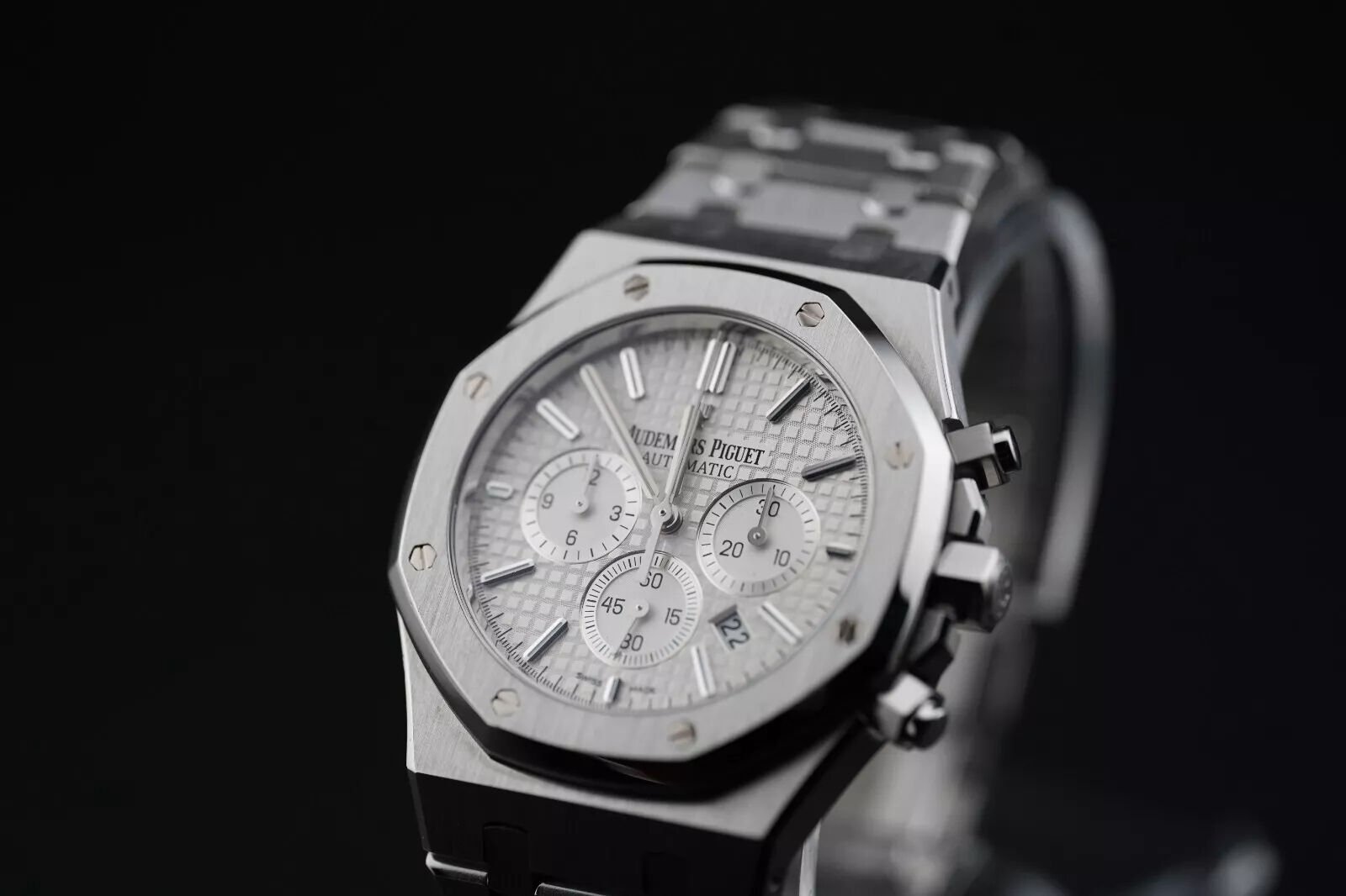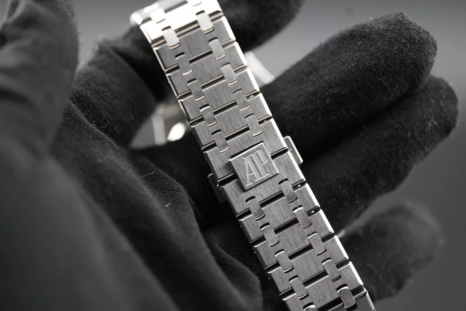 Dial: Silver-toned dial with Grande Tapisserie pattern. White gold applied hour-markers and Royal Oak hands with luminescent coating