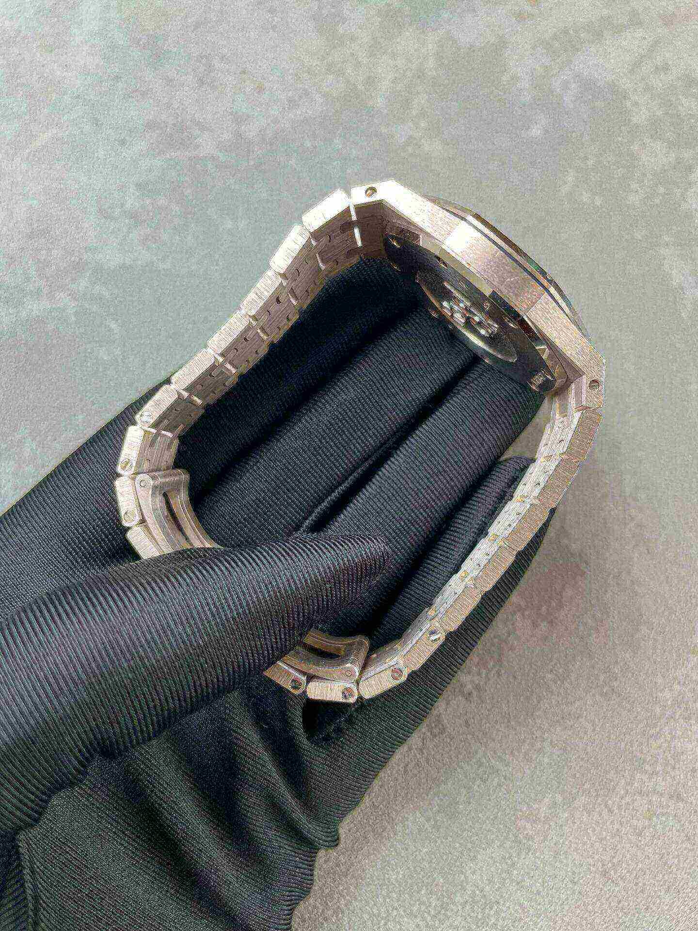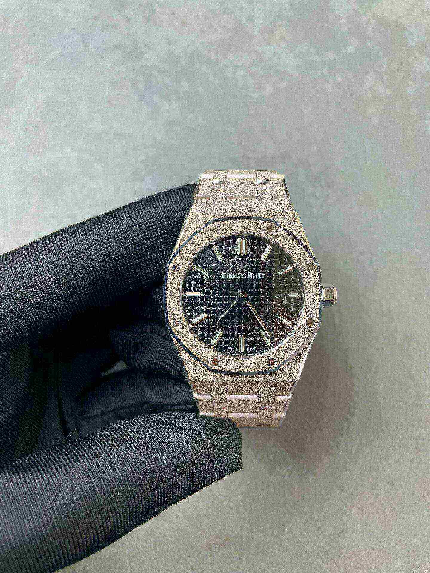 Dial: Black dial with Grande Tapisserie pattern. White gold applied hour-markers and Royal Oak hands with luminescent coating