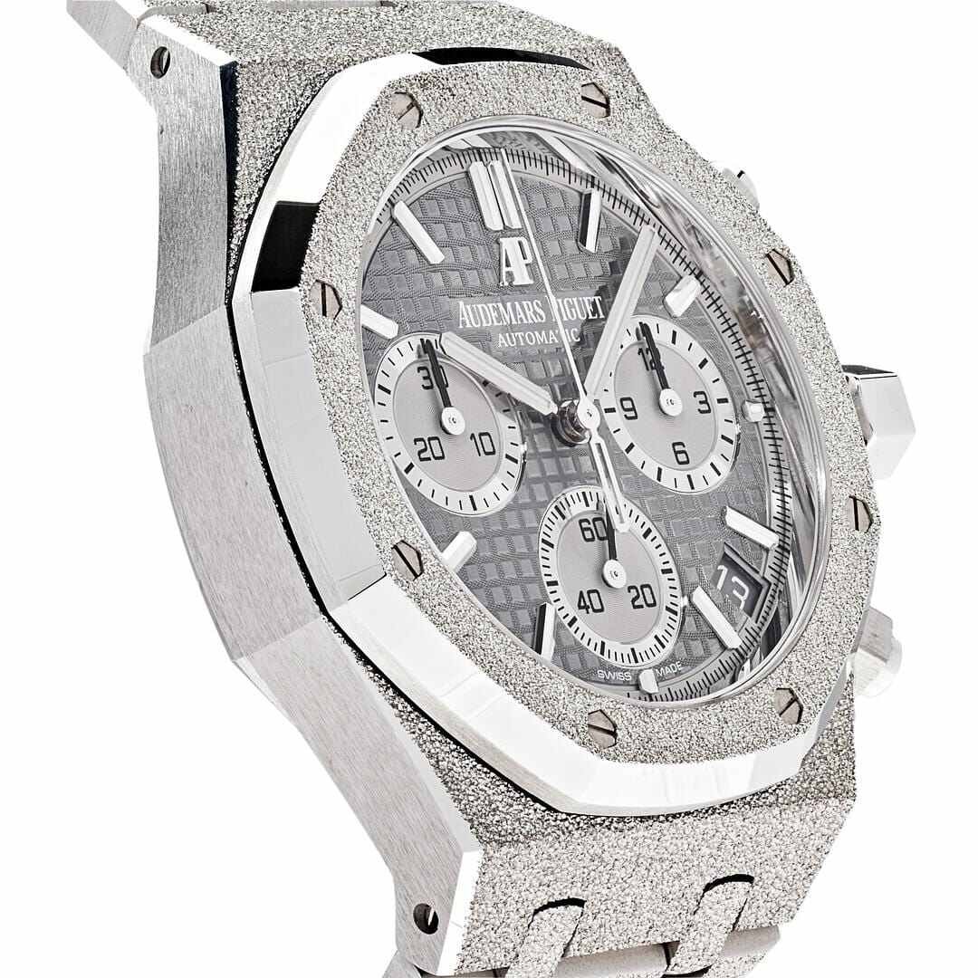 The Audemars Piguet Royal Oak Frosted Chronograph is a stunning timepiece that combines the best of both worlds: a sophisticated design with an automatic movement. This watch features a grey dial. 41mm case white gold case. and a frosted white gold bracelet.