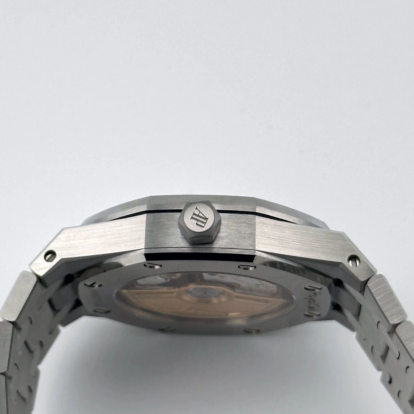 The silver-toned dial. adorned with the Grande Tapisserie pattern. adds depth and texture while maintaining a clean. understated look. The applied white gold hour markers and luminescent-coated hands ensure optimal legibility. Paired with the integrated stainless steel bracelet. this timepiece offers seamless design and everyday versatility. Ideal for collectors seeking a modern yet classic Royal Oak. the 77350ST.OO.1261ST.01 embodies the perfect balance of sophistication and practicality.