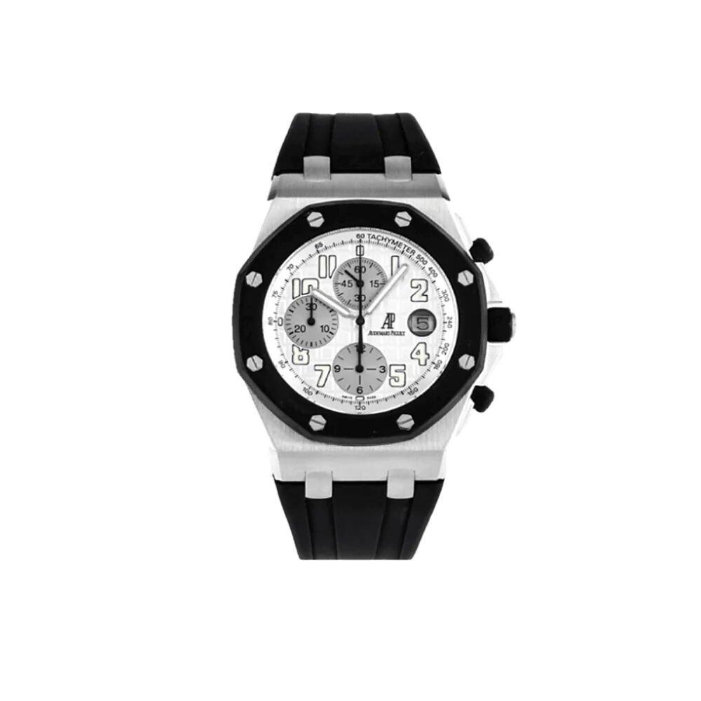 This Royal Oak Offshore is designed in a 42mm stainless steel case. It features a white ‘Mega Tapisserie’ dial with luminous hour-markers and sub-dials. The watch comes on a black rubber strap with a stainless steel pin buckle. This piece provides chronograph. 30-minute counter and 12-hour counter functionality complimented by a tachymeter scale on the inner bezel.
