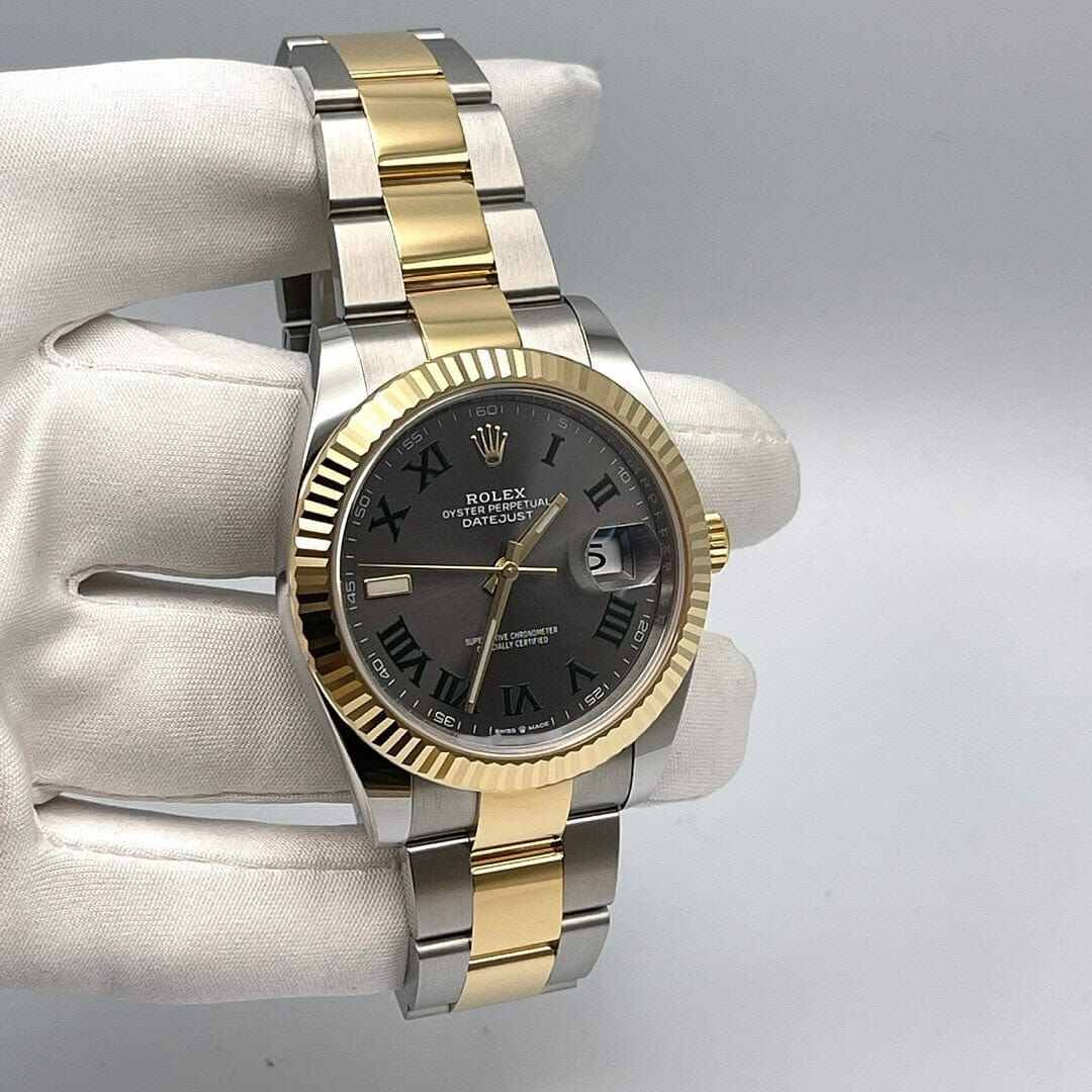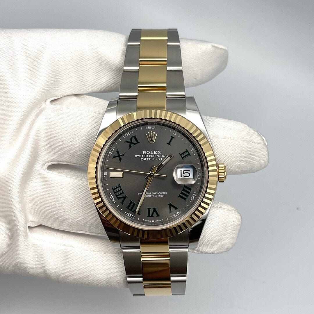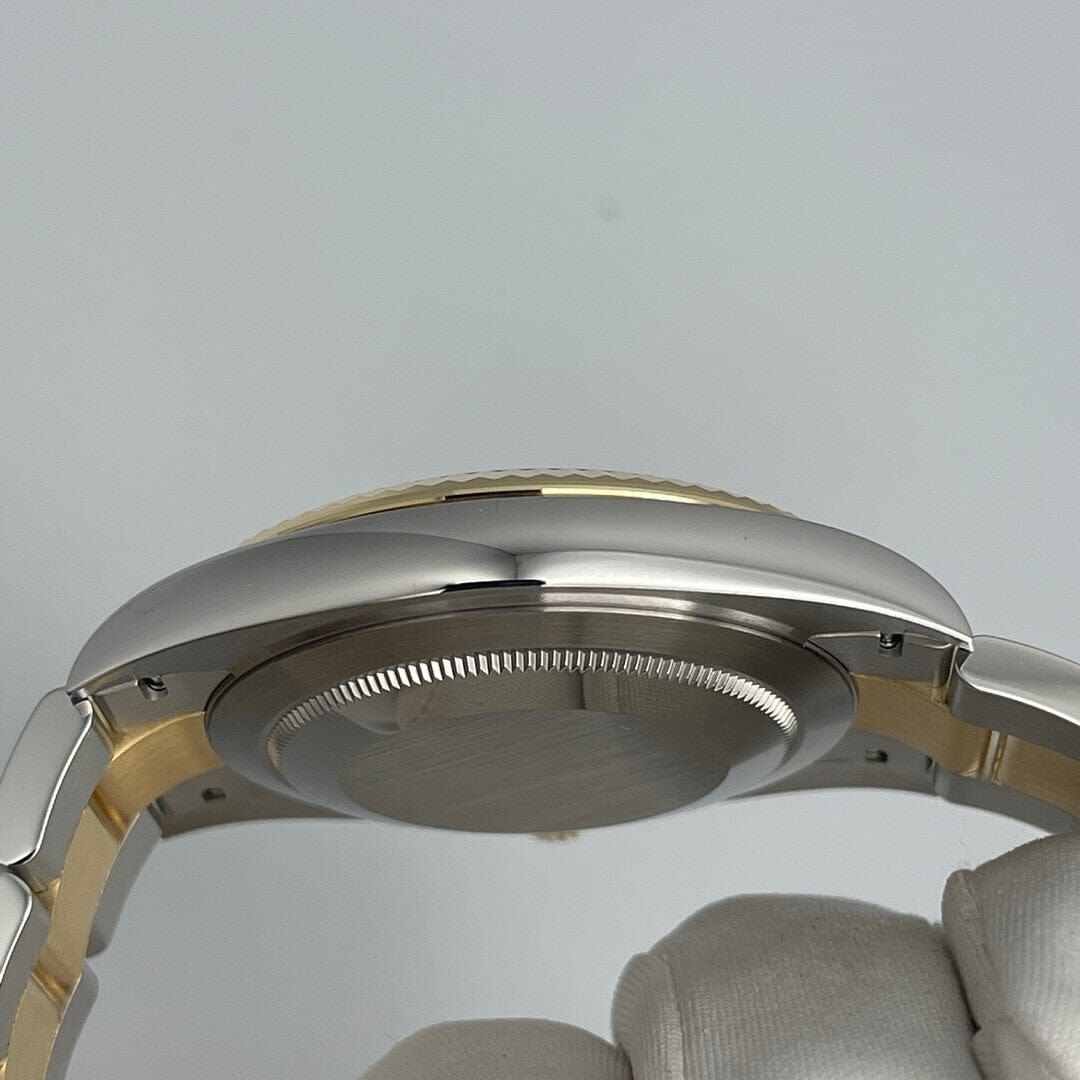 The Rolex Datejust is designed with a 41mm stainless steel case. highlighted by the distinctive yellow gold fluted bezel. It features green roman numerals. yellow gold hands and date display at 3 o’clock protected by a scratch-resistant sapphire-crystal. On the wrist the yellow gold and stainless steel bracelet is a true beauty.