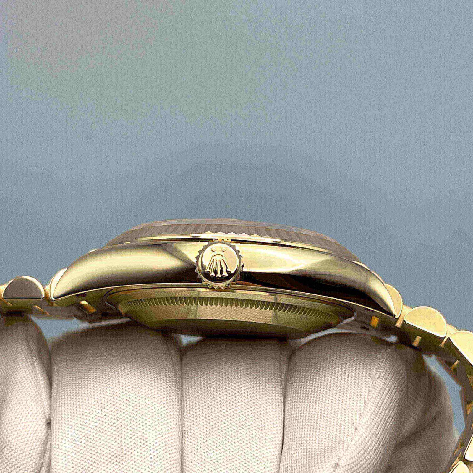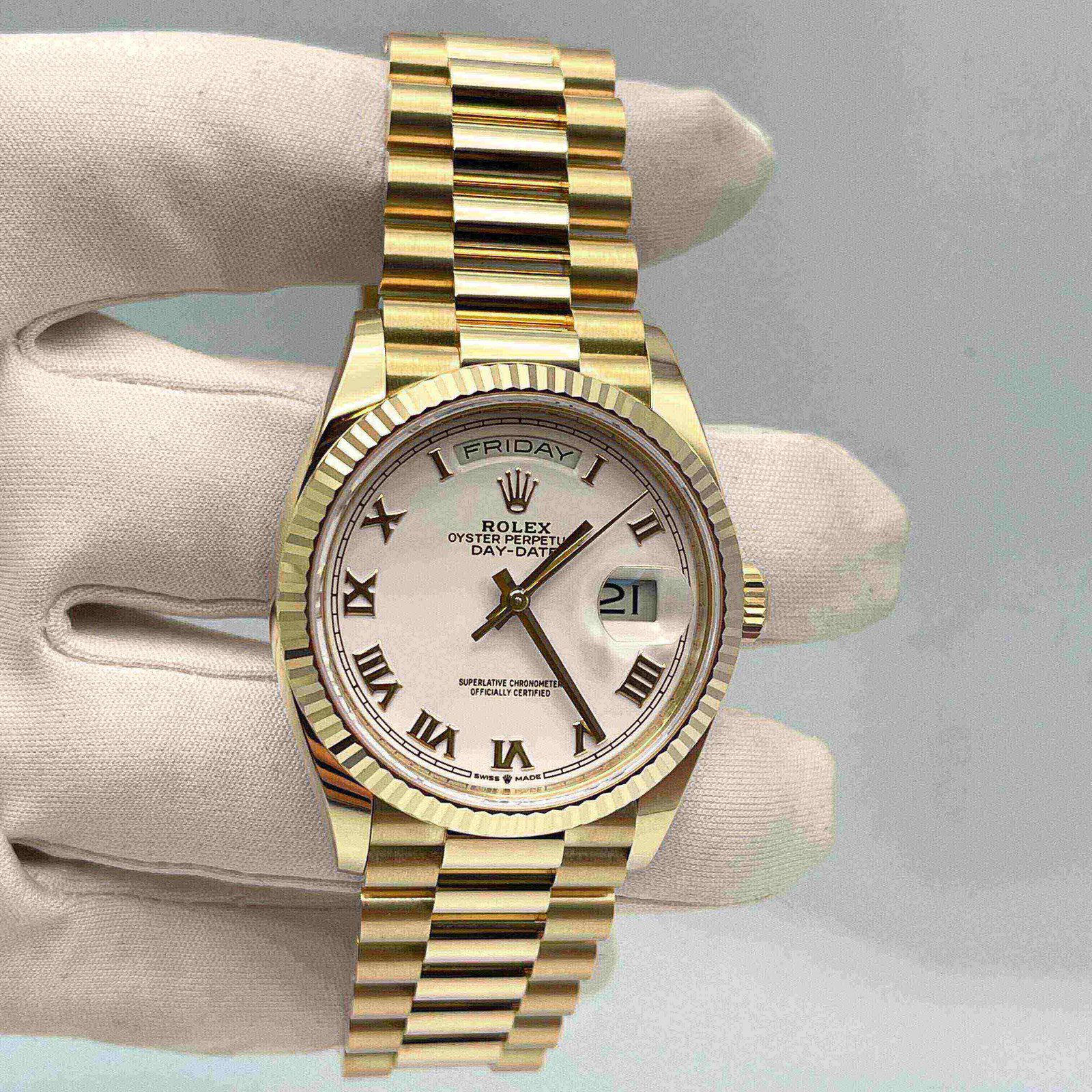 The Oyster Perpetual Day-Date is inlaid in a sophisticated 36mm 18k yellow gold case surrounding a white dial with yellow gold roman numerals markers and hands. The signature fluted bezel is an aesthetic element and distinctive feature for the Rolex brand. The symbolic 18k yellow gold presidential bracelet includes semi-circular three-piece links and concealed Crownclasp, being the most sought-out timepiece to date.