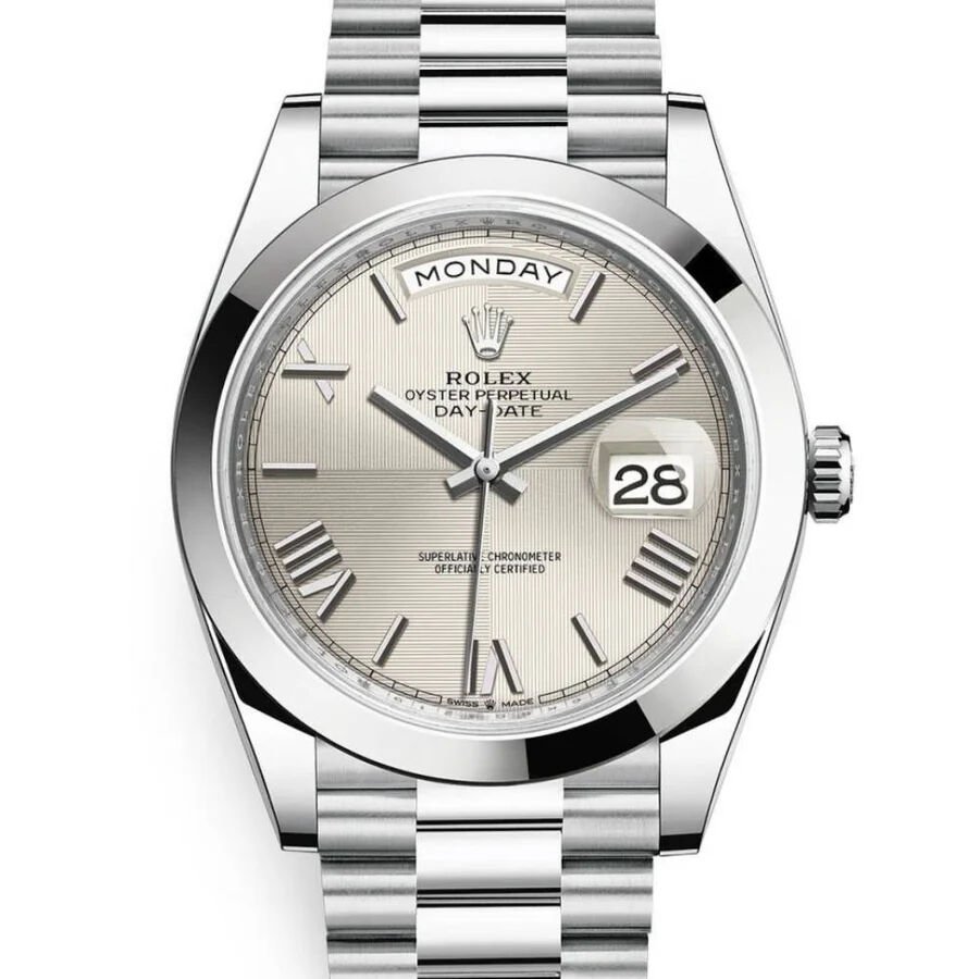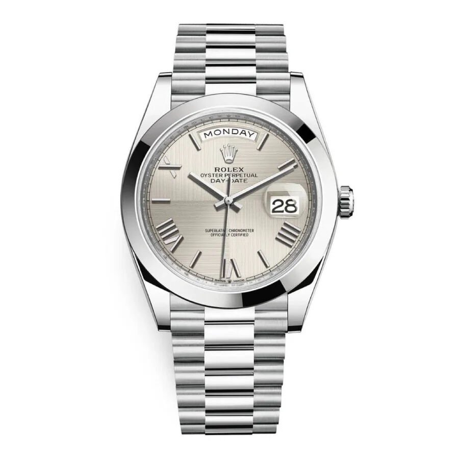 The Oyster Perpetual Day-Date is inlaid in a 36mm 18k white gold case surrounding a white dial with white gold roman numerals markers and hands. The signature fluted bezel is an aesthetic element and distinctive feature for the Rolex brand. The symbolic 18k white gold presidential bracelet includes semi-circular three-piece links and concealed Crown-clasp.