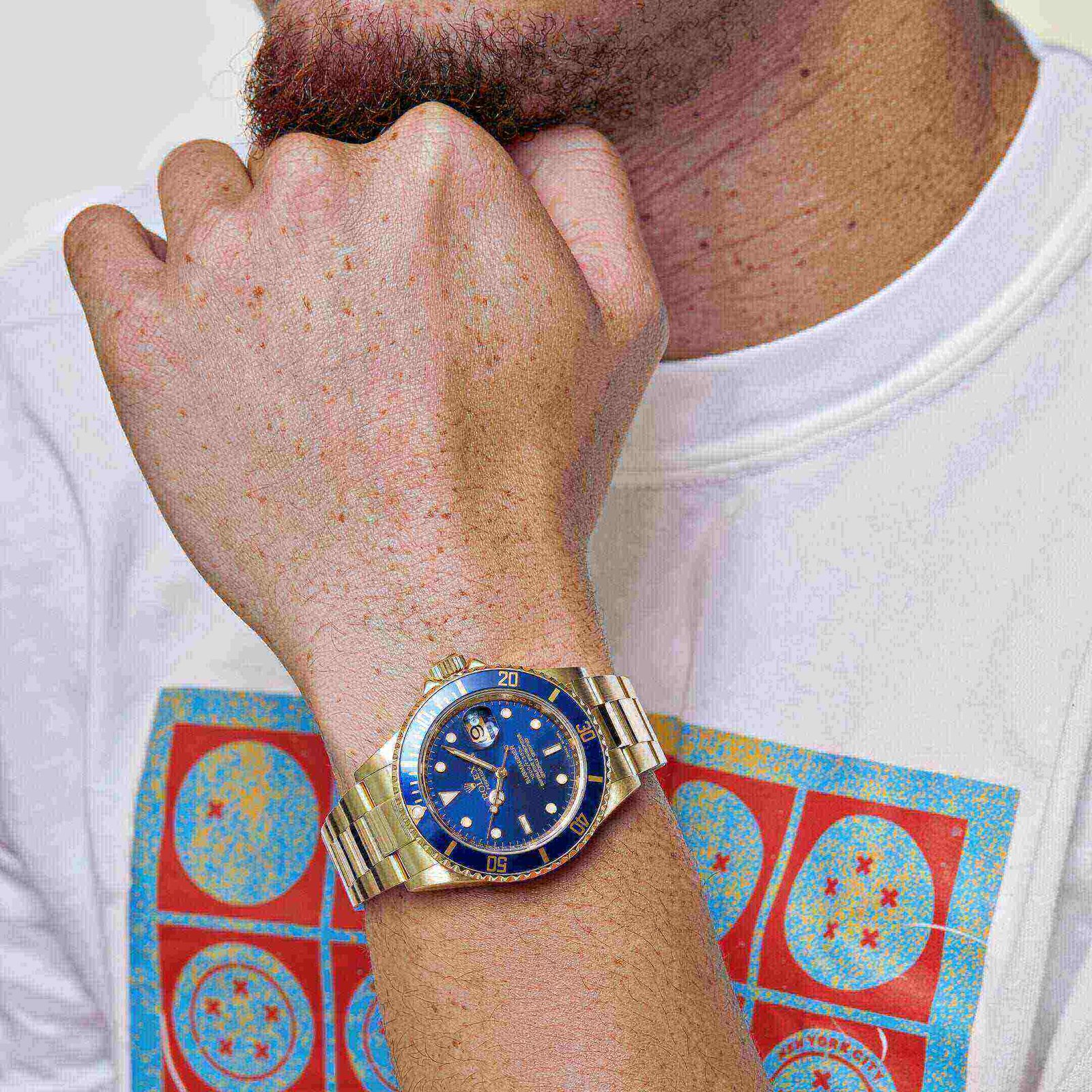 This Rolex Submariner Date 16618LB is designed in a 40mm 18k yellow gold case, blue dial with a date window at 3 o’clock and matching blue bezel. The aluminum bezel has ribbed edges that are easy to grip underwater. Luminous hour markers, hands, and a Chromalight display provide clear legibility in every circumstance. Features that let the wearer take full advantage of the 60-minute increment function and safely keep track of their dive. Styled on a matching yellow gold bracelet, reference 16618LB includes an extension on the bracelet so divers can fit the watch over their wetsuits. The Rolex Submariner Date 16618LB is a reliable timepiece, ready for any adventure.