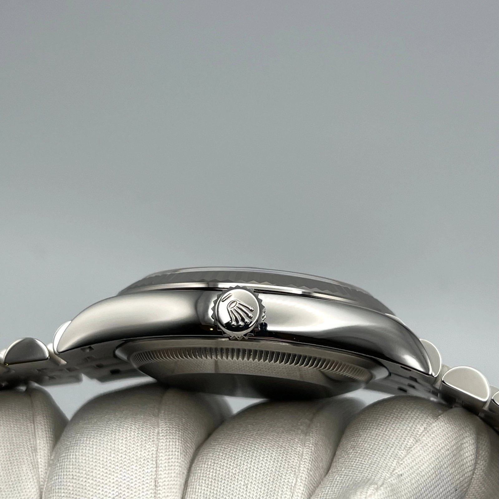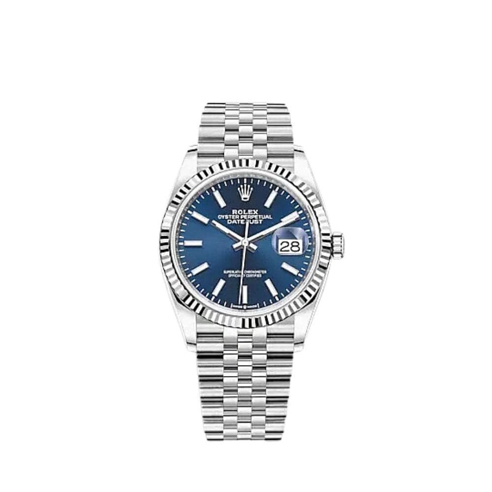 The Rolex Datejust is designed with a 36mm Stainless steel and White Gold case. highlighted by the distinctive white gold fluted bezel. It features a blue dial surrounded by white stick hour markers. white gold hands and a date display at 3 o’clock. protected by a scratch-resistant sapphire-crystal. On the wrist the white gold and stainless steel jubilee bracelet is a true beauty.